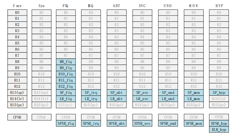 上一篇博客提到了 Cortex-A7 有 9 种运行模式,每一种运行模式都有一组与之对应的寄存器组。每一种模式可见的寄存器包括 15 个通用寄存器 (R0-R14)、一两个程序状态寄存器和一个程序计数器 PC。在这些寄存器中,有些是所有模式所共用的同一个物理寄存器,有一些是各模式自己所独立拥有的,各个模式所拥有的寄存器如下所示: