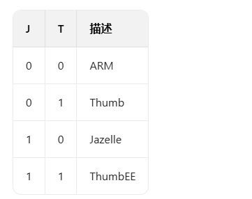 - J (bit24):仅 ARM_v5TE-J 架构支持,J=1 表示处于 Jazelle 状态,此位通常和 T (bit5) 位一起表示当前所使用的指令集,如下表所示:
