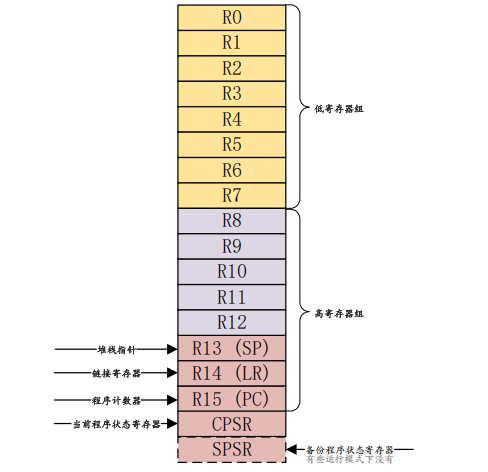 未备份寄存器指的是 R0~R7 这 8 个寄存器,因为在所有的处理器模式下这 8 个寄存器都是同一个物理寄存器,在不同的模式下,这 8 个寄存器中的数据就会被破坏。所以这 8 个寄存器并没有被用作特殊用途。