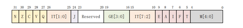 因为 User 和 Sys 这两个模式不是异常模式,所以没有配备 SPSR,因此不能在 User 和 Sys 模式下访问 SPSR,这会导致不可预知的结果。由于 SPSR 是 CPSR 的备份,因此 SPSR 是和CPSR的寄存器结构相同,如下图所示: