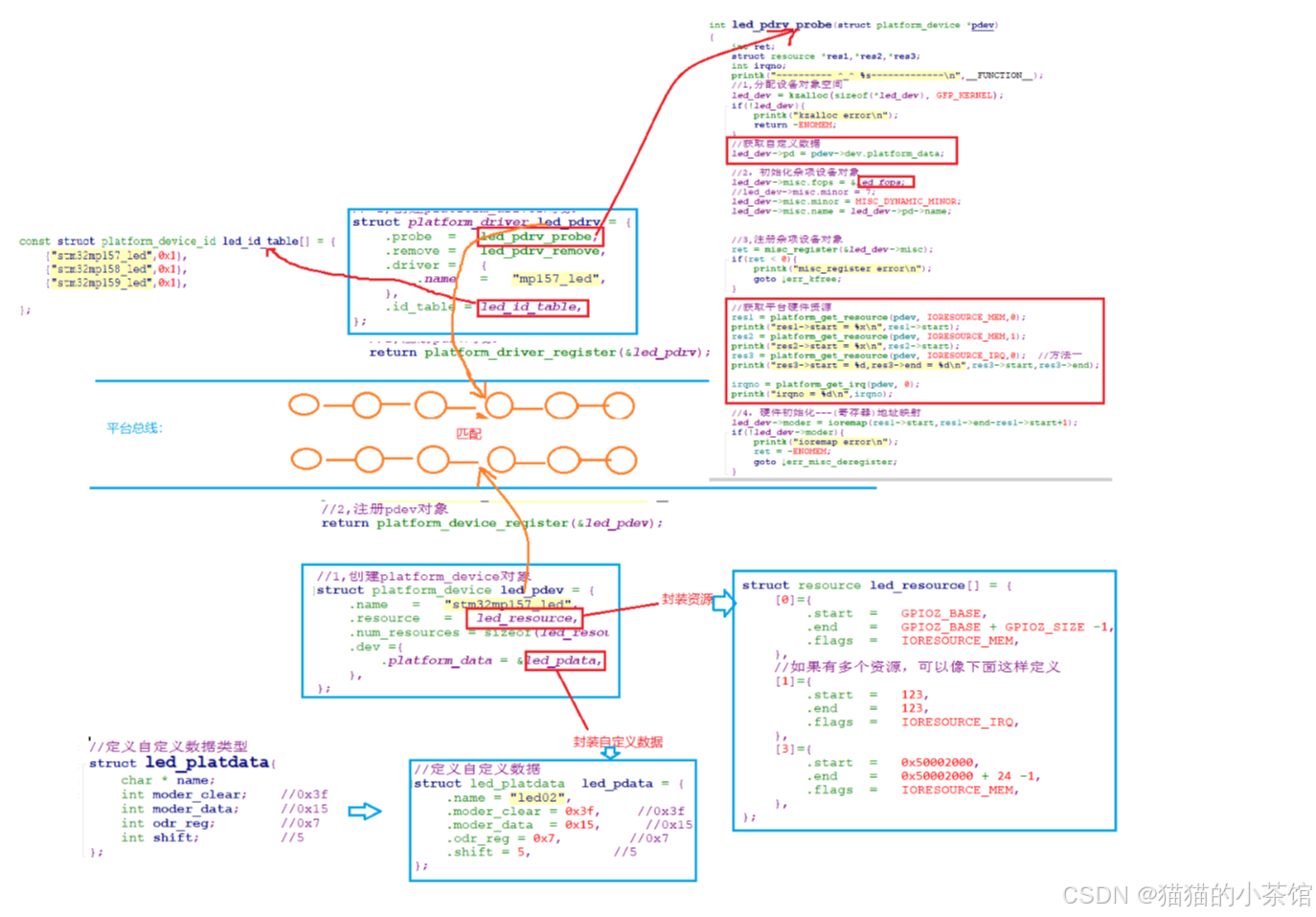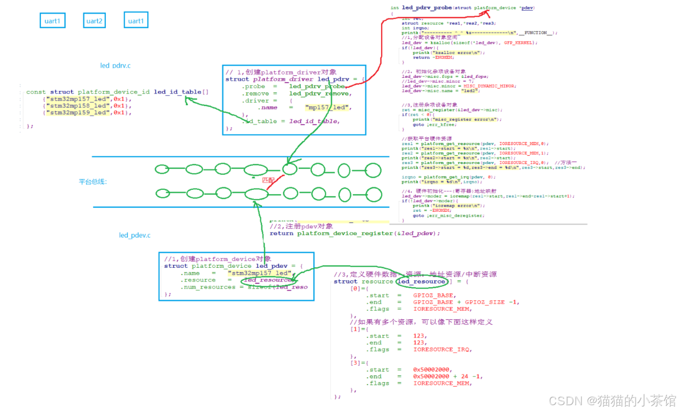 板级硬件差异 :不同板子上的 LED 只有寄存器地址、GPIO 编号不同,其余逻辑相同。平台总线框架把硬件数据 (