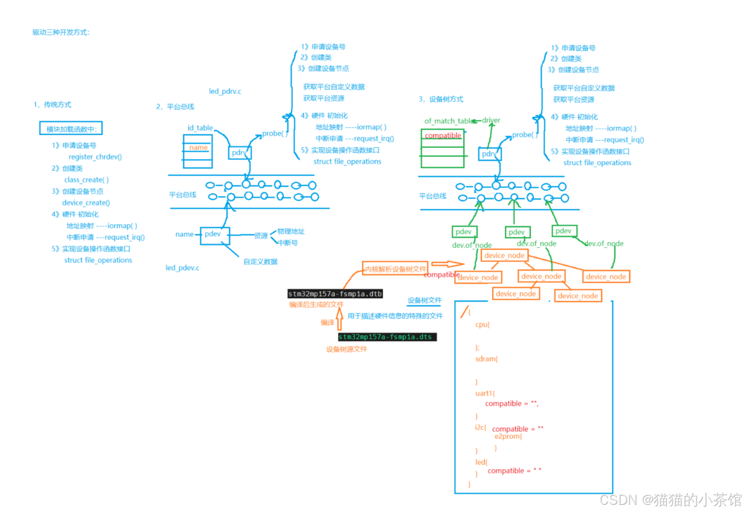 platform_device(硬件数据)、platform_driver(通用操作)、platform_bus(配对)。 - 设备树将硬件信息外置化 ,通过
