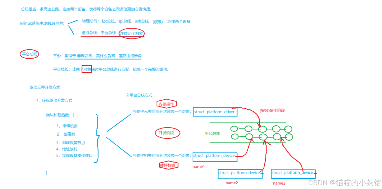 - 平台总线(platform bus)的作用是将硬件数据与通用操作分离,实现驱动复用;