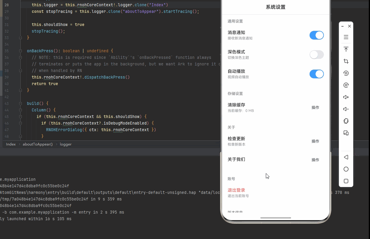 原生可点击按钮,实现开关切换、清除缓存、检查更新等按钮,鸿蒙端点击反馈流畅 | ✅ 无按压波纹失效、点击无响应等兼容问题,交互体验和鸿蒙原生一致 |