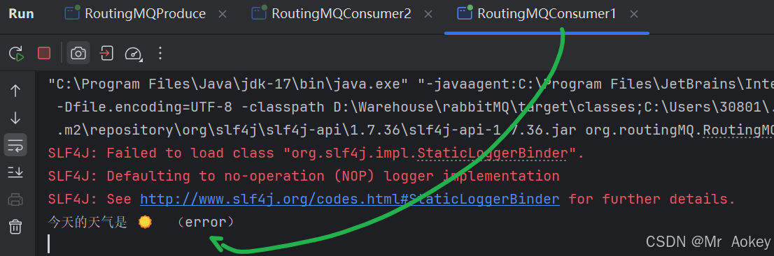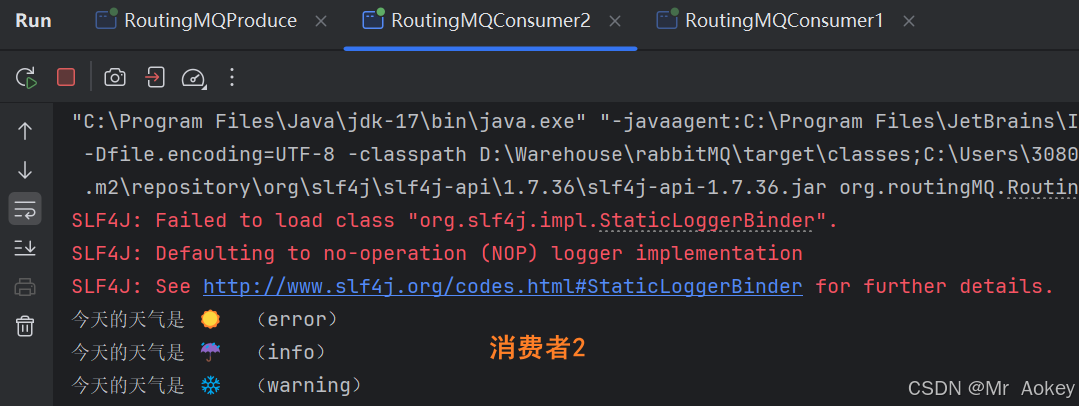 (此处有两个消费者分别订阅不同的队列,见路由模式图,代码逻辑类似,只是消费消息中basicConsume 方法里的队列不同,故此处仅列举一个消费者)