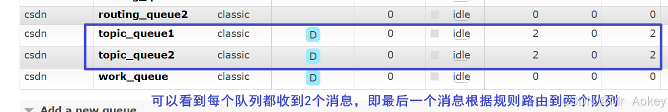 启动生产者,消费者,可见图形化界面显示1条消息发送到消费者1订阅的队列,3条消息发送到消费者2订阅的消息