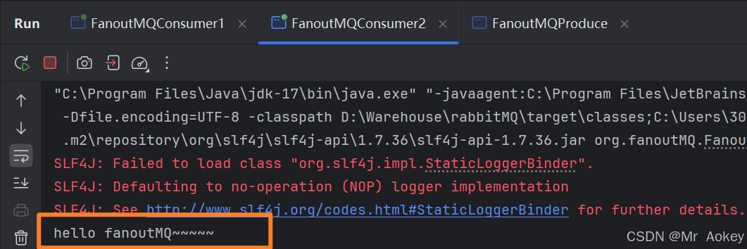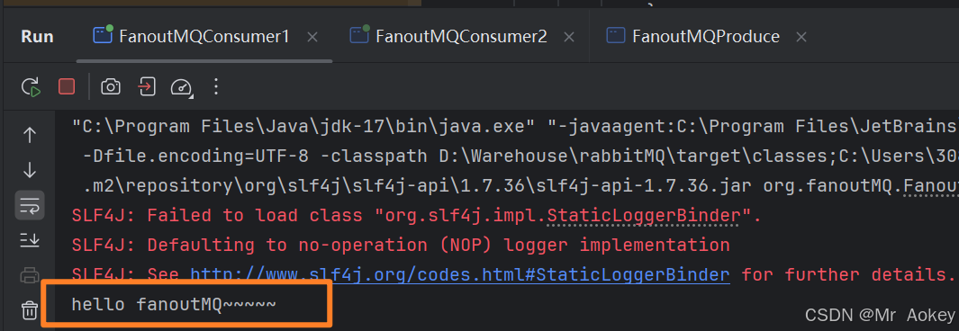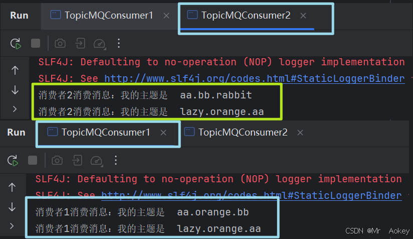 分别运行两个消费者,下图可发现,两个消费者都能接受到生产者发送的消息