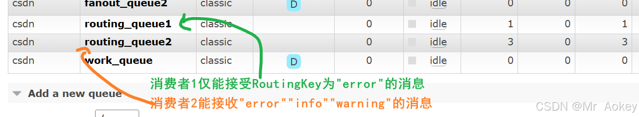 注意:在消费者代码逻辑中没有看到声明交换机和队列,因为当生产者或消费者其中一方声明交换机或队列后,另一方使用时可以不再声明(对于已经存在的交换机和队列,可以直接使用),但是建议双方都声明一下,倘若不存在系统会报错