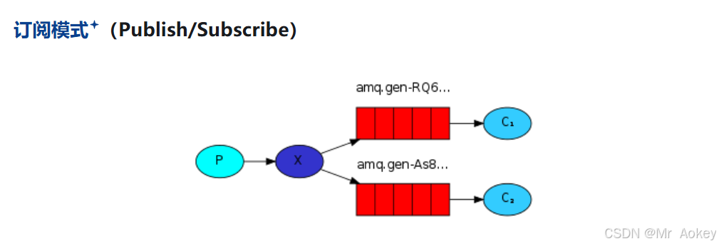 订阅模式是一对多的广播模式,类似于气象台每日把天气信息发送给每个订阅者,由上图可知,该模式由一个交换机,多个队列,多个消费者组成,每个消费者都能接收到来自交换机发出的消息。