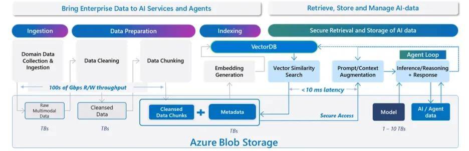 在推理阶段,Azure Blob Storage 为 Microsoft Foundry Agent Knowledge、AI Search Retrieval Agents 等 AI 服务提供行业领先的存储支持,客户可直接接入自有存储账户,确保数据安全合规的同时,高效支撑检索增强生成(RAG)场景。Premium Blob Storage 将检索性能提升 3 倍,而 LangChain Azure Blob Loader 国际版通过深度优化,实现 5 倍性能提升与细粒度安全控制,满足开源 AI 框架用户的高性能需求。此外,Azure 存储发现(Storage Discovery)与 Azure Copilot 的协同能力,让企业可通过自然语言交互洞察数千亿级对象的数据资产变化,实现 AI 训练与微调的精细化管理。