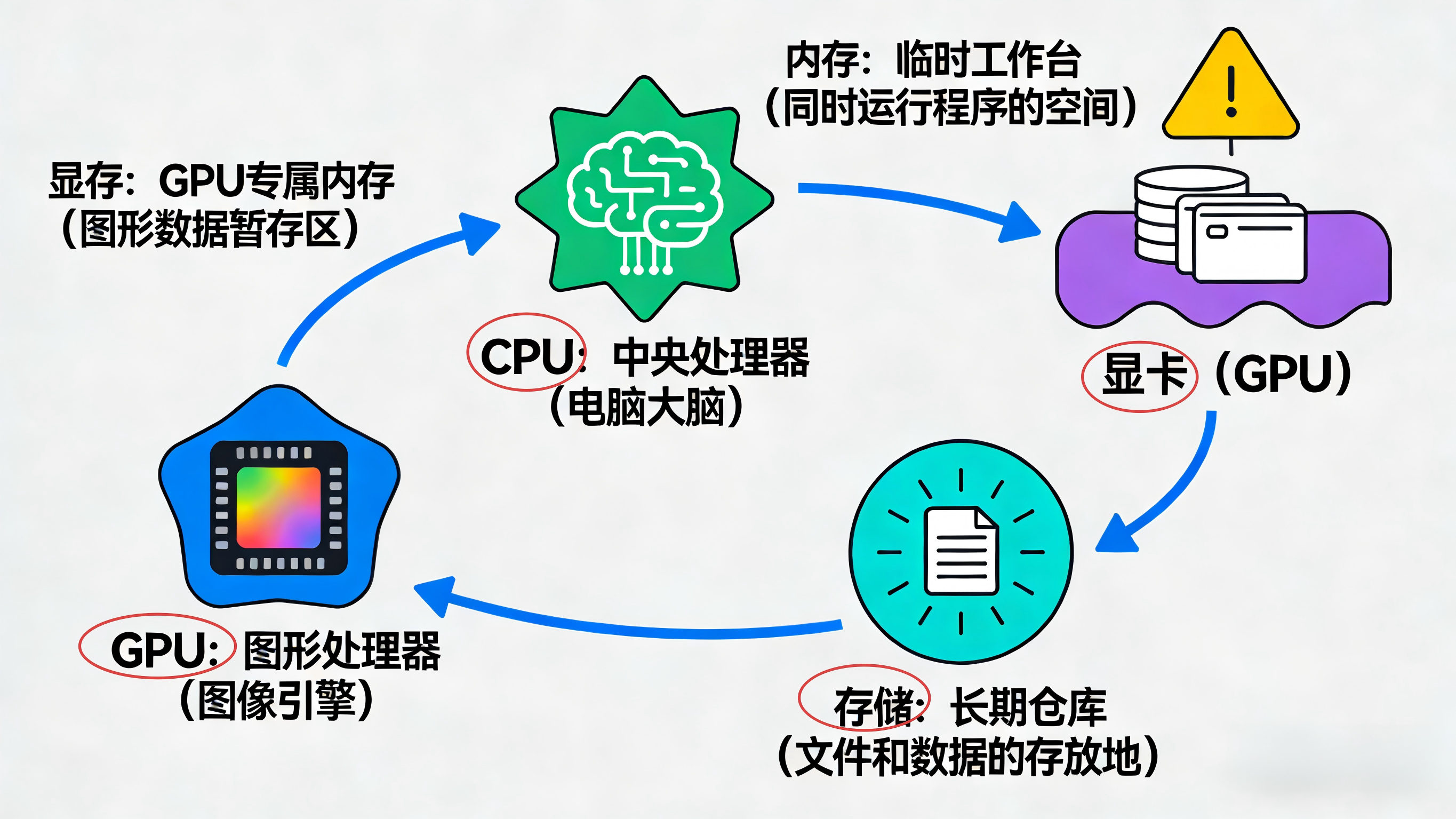 | 显存 | GPU 专用的高速存储,用于临时存储图形数据,容量和带宽影响 3D 渲染、高分辨率画面处理能力。 | 显卡的 "专属工作台",负责临时存放图形数据,容量越大越能处理复杂画面。 | NVIDIA RTX 4060 的 8GB GDDR6 显存、AMD RX 7900 XT 的 20GB GDDR6 显存 |