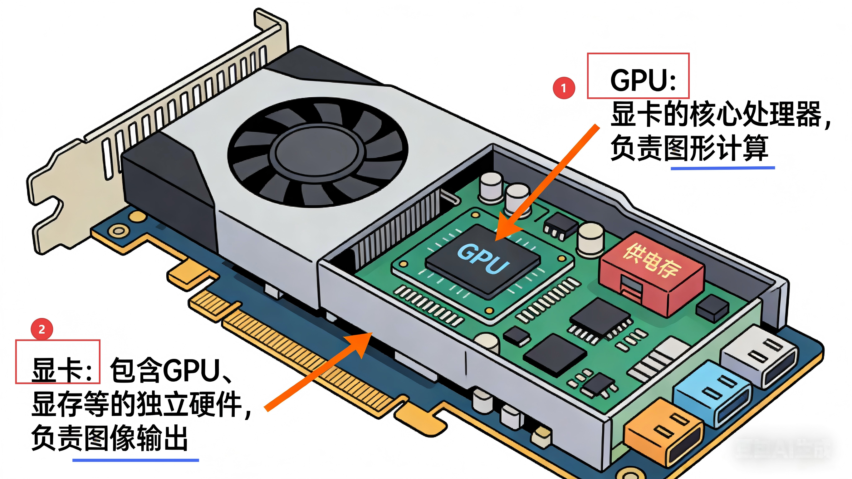 | 显卡 | 包含 GPU、显存等硬件的组件,分为集成显卡(与 CPU 集成)和独立显卡(独立硬件),负责输出图像信号到显示器。 | 电脑的 "画面输出器",决定了游戏画质、视频渲染速度。 | NVIDIA GeForce RTX 4090(独立显卡)、AMD Radeon 780M(集成显卡) |