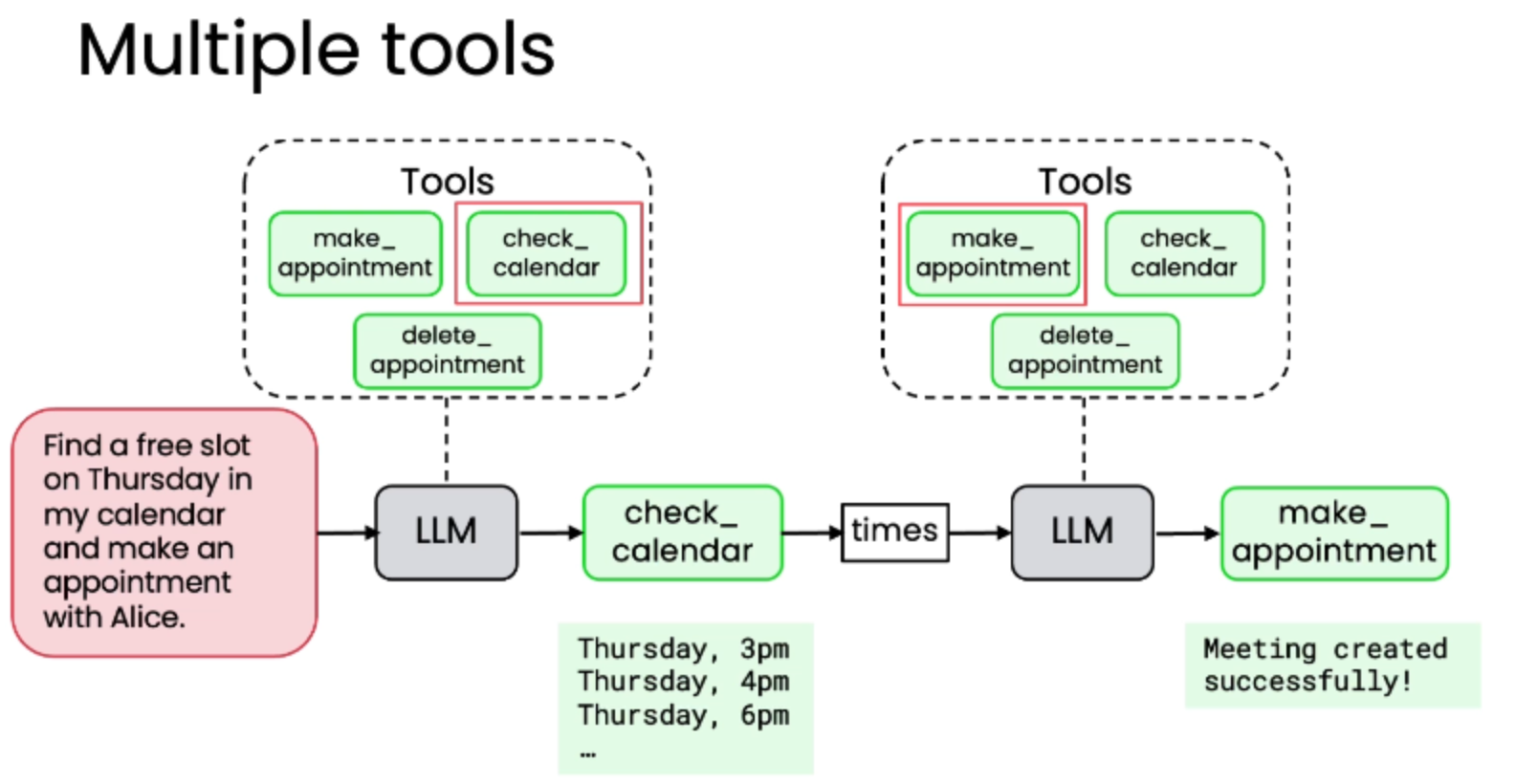 最终,模型整合信息,回复用户:"Your appointment is set up with Alice at 3 PM Thursday."