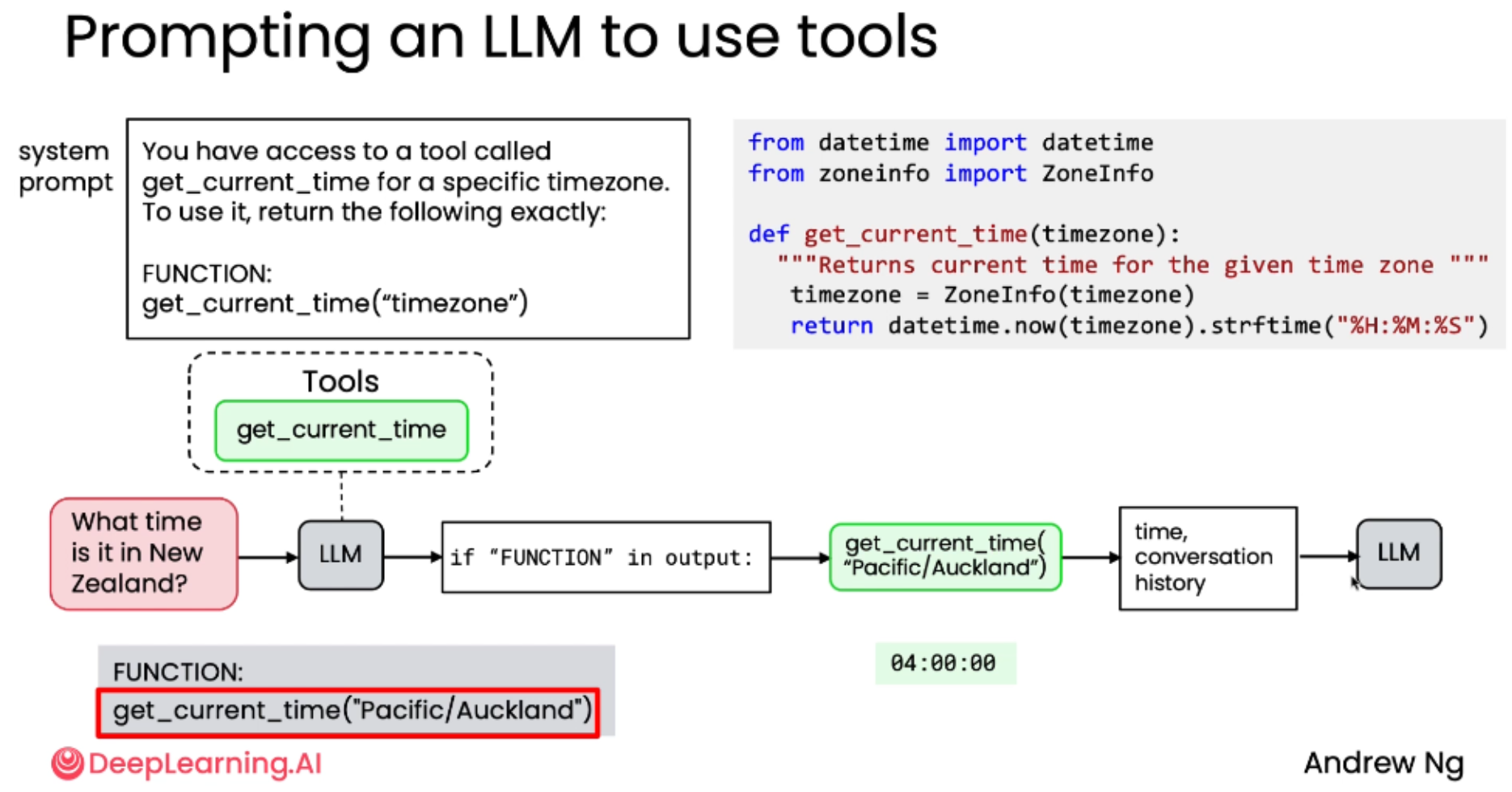 "04:00:00")反馈给 LLM,最终 LLM 回复:"It's 4am in New Zealand."