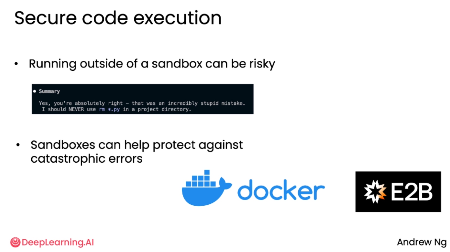 轻量级沙盒:推荐使用像 Docker 或 E2B 这样的轻量级沙盒环境,它们能有效隔离代码,降低损坏系统或环境的风险。