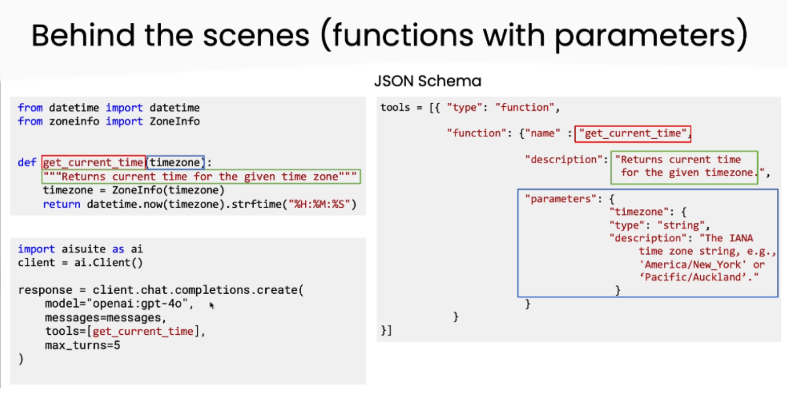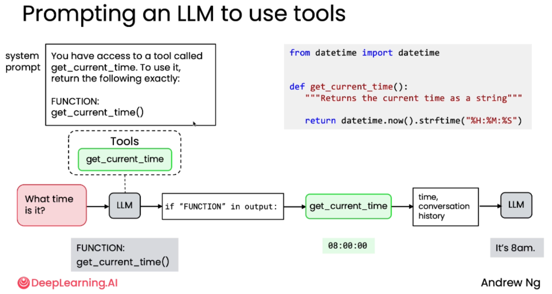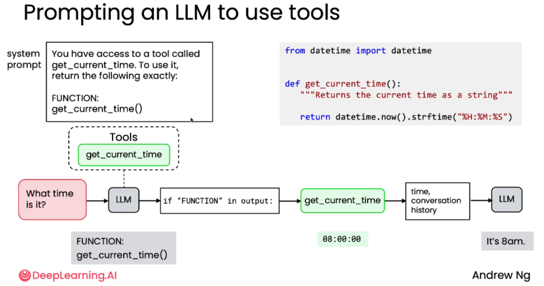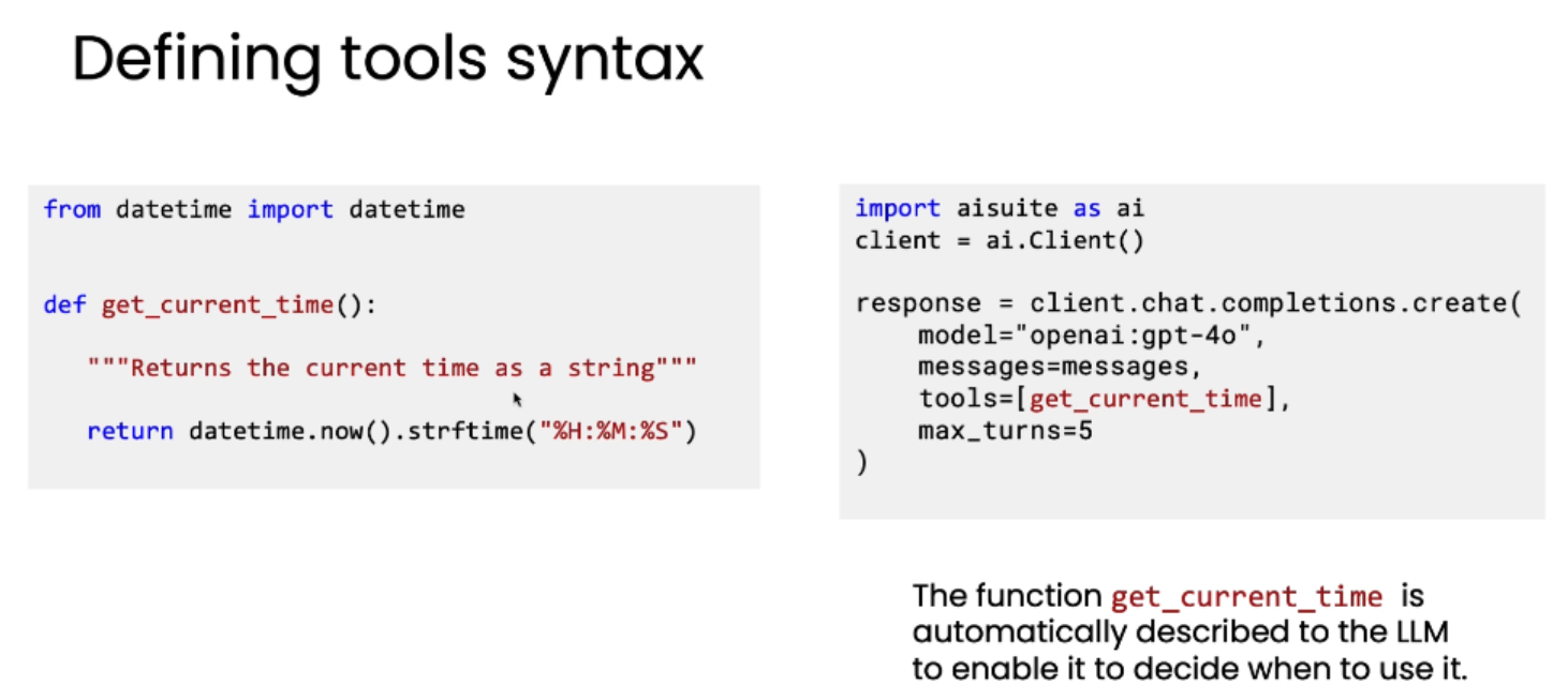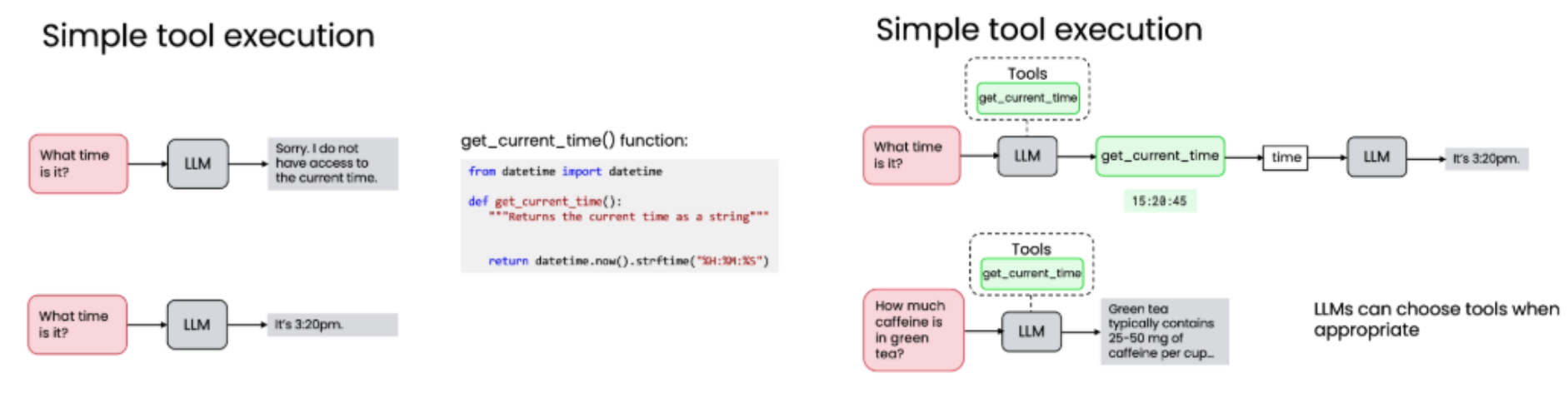 调用工具的例子:当被问及"现在几点?",模型知道需要实时数据,因此调用 get_current_time()。
