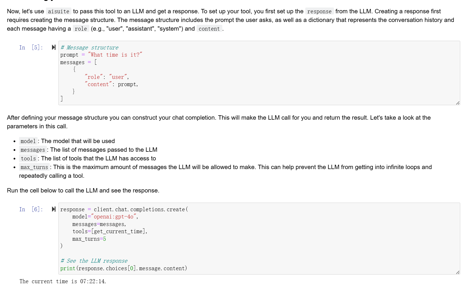 - 模型决策 (Model Decision): LLM 意识到自己无法提供实时时间,于是查看可用工具集合,然后决定调用工具,这里调用函数名为 get_current_time() 。