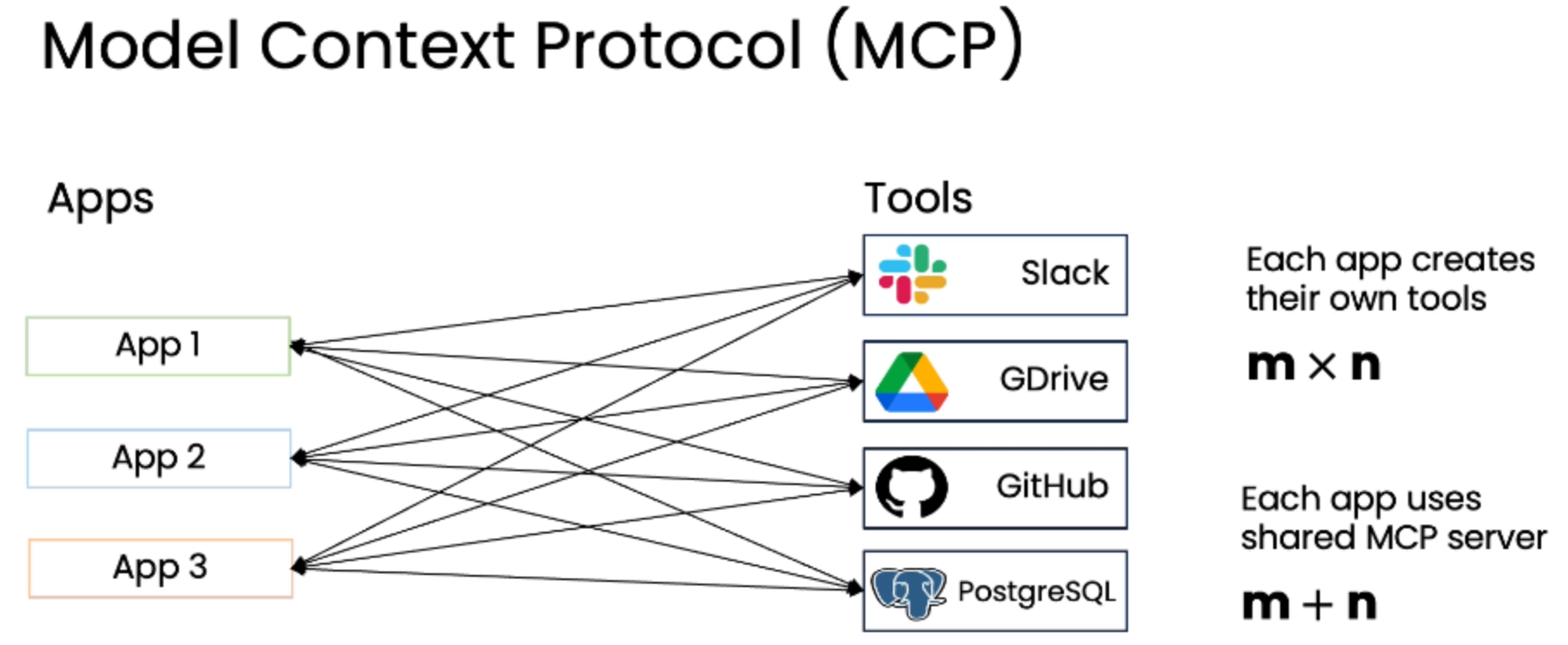 n个 MCP 服务器(每个对应一个工具),然后让m个应用去连接这些服务器。 -