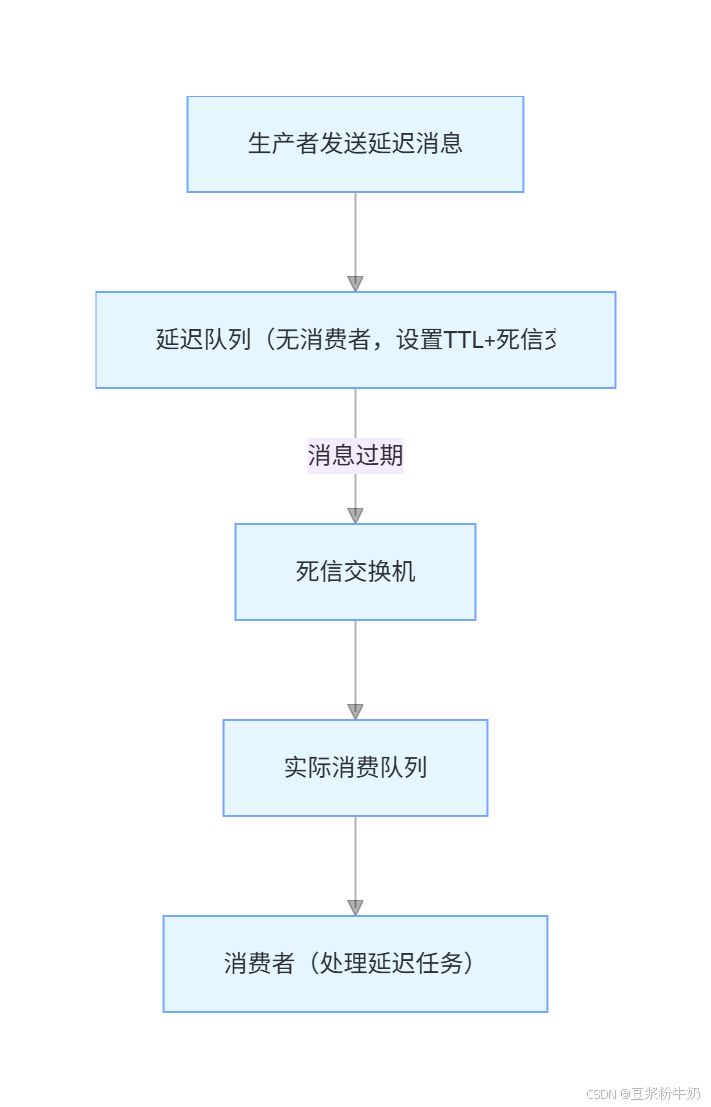 - 死信交换机再把消息路由到实际消费队列,消费者监听这个队列,就能拿到 "延迟后的消息"。