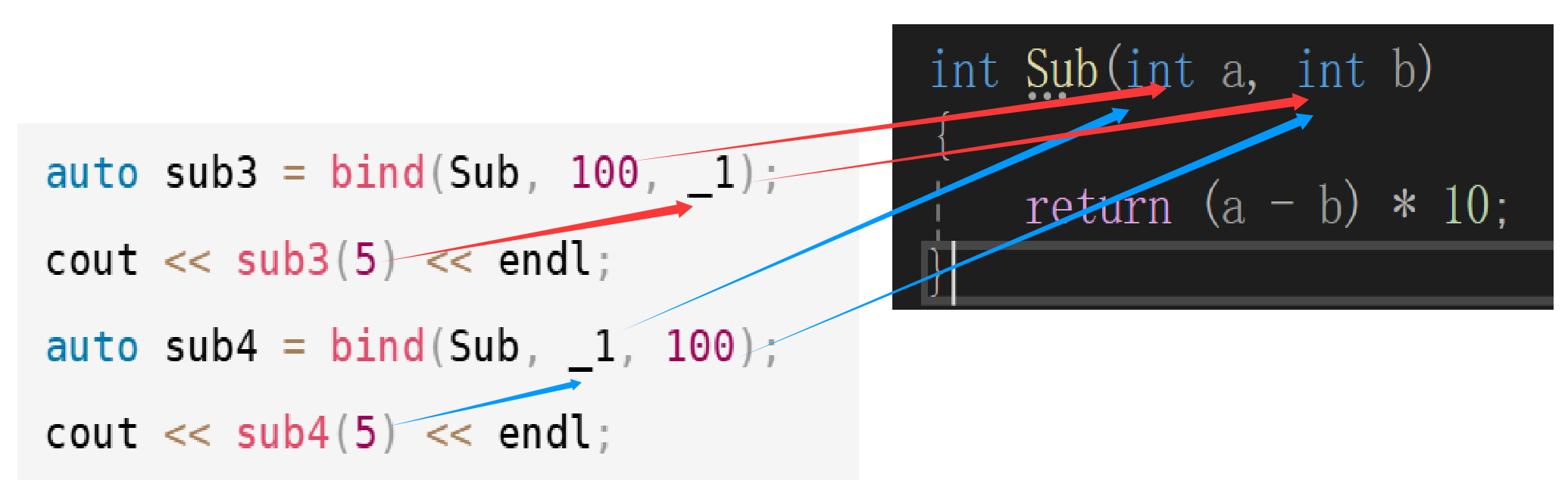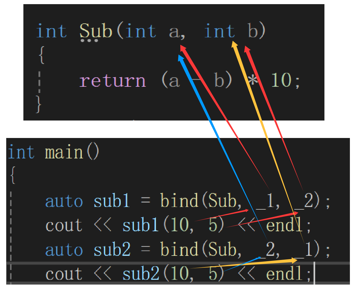 _1始终代表第一个参数,_2代表第二个参数,传参的时候还是根据顺序传参,所以sub1(10, 5) 为50,sub2(10, 5) 为-50