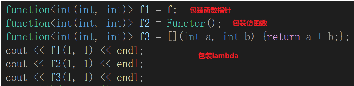 function<int(int, int)> f3 = [](int a, int b) {return a + b;};