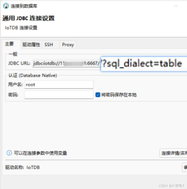jdbc:iotdb://你自己的电脑 IP 地址:6667/ - 用户名:root(按自己的填写)
