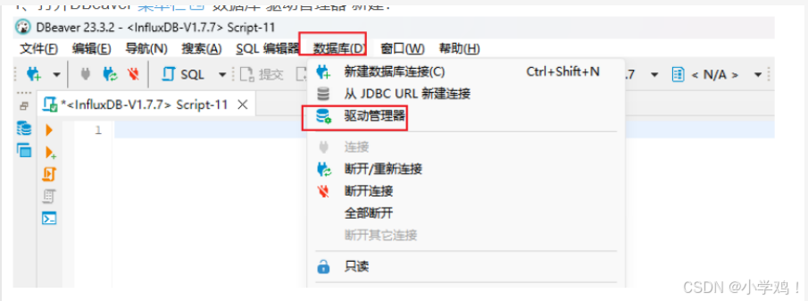 1、打开 DBeaver ---> 菜单栏处选择 ---> 数据库 ---> 驱动管理器 ---> 新建: