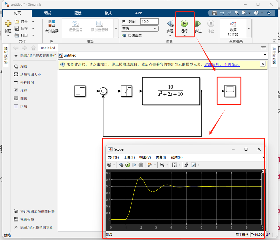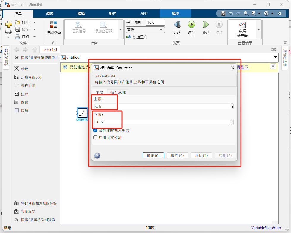 运行 :点击顶部的绿色 Run 按钮。双击 Scope 观察:你会发现波形在达到 0.5 左右时变平缓了,这就是饱和特性。