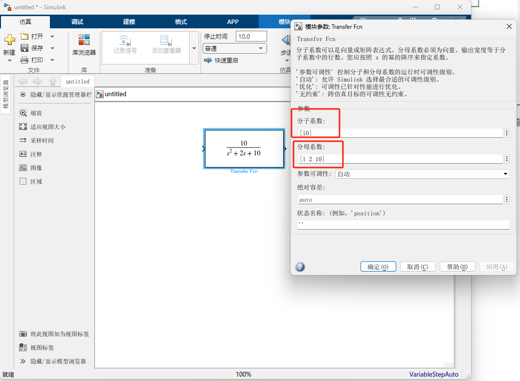 Numerator为[10],Denominator为[1 2 10]。