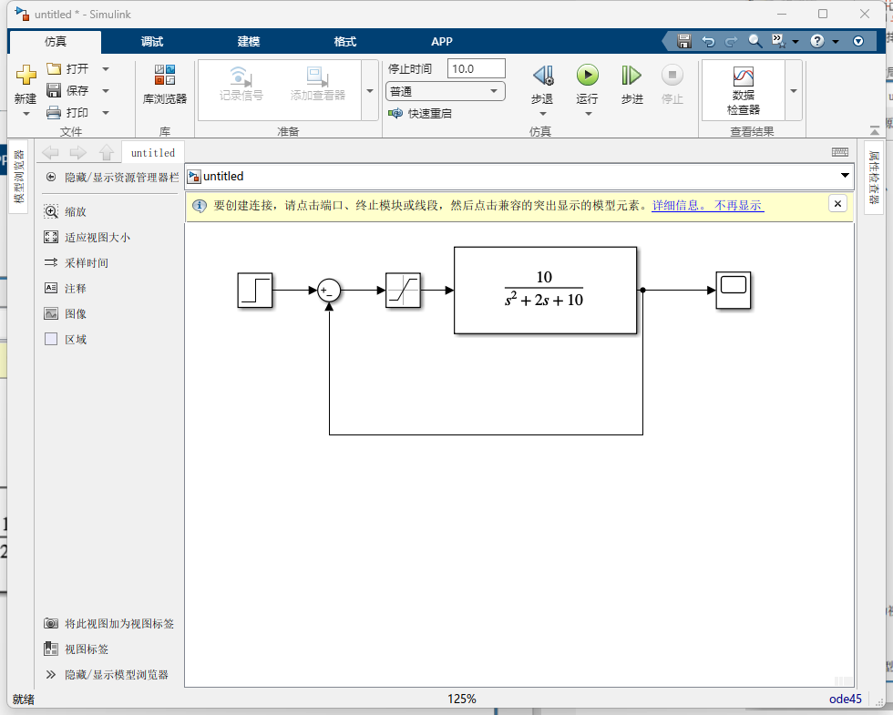 Ctrl+E打开设置。 Stop time设为10。Type选Variable-step,Solver选ode45(这是最通用的)。