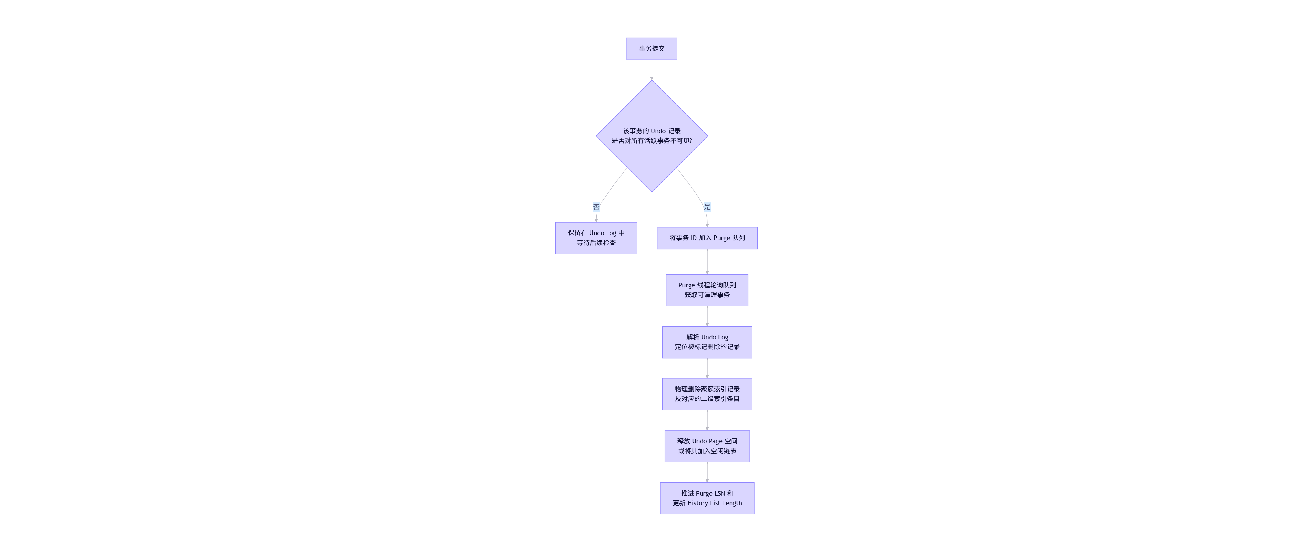 - 当一个事务提交后,其对应的 Undo 记录会被标记为"可 Purge",但不会立即清理。