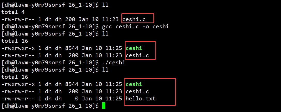我们先查看一下当前目录,发现是没有hello.c这个文件的,然后当我们运行后再查看会发现hello.c的文件出现了。