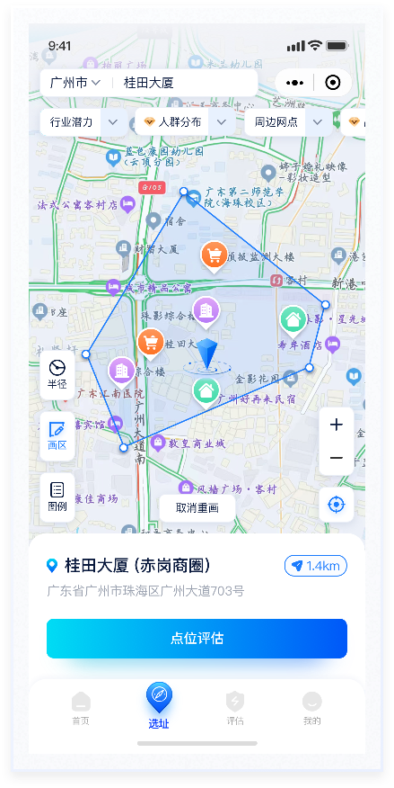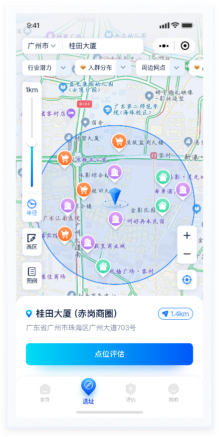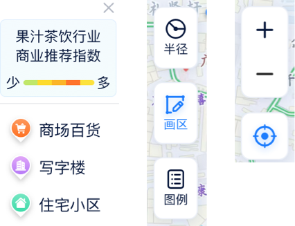 按钮换肤在地图上,"半径""选区"便于用户对开店范围的选择,"图例"则更侧重图标说明性。"放大""缩小""定位"则是对显示内容的操作。
