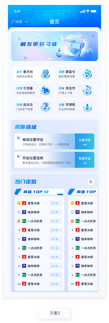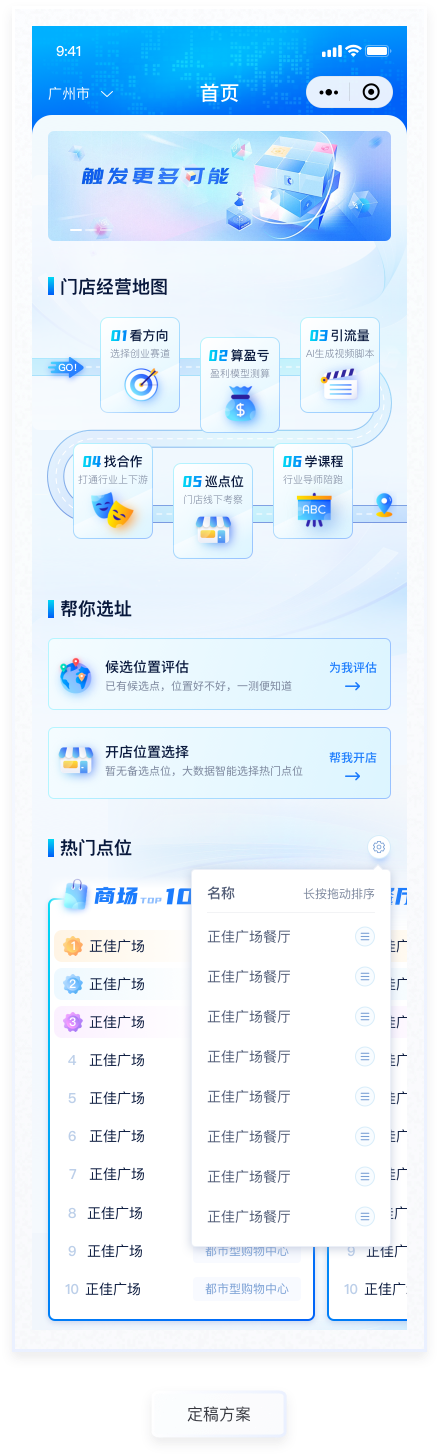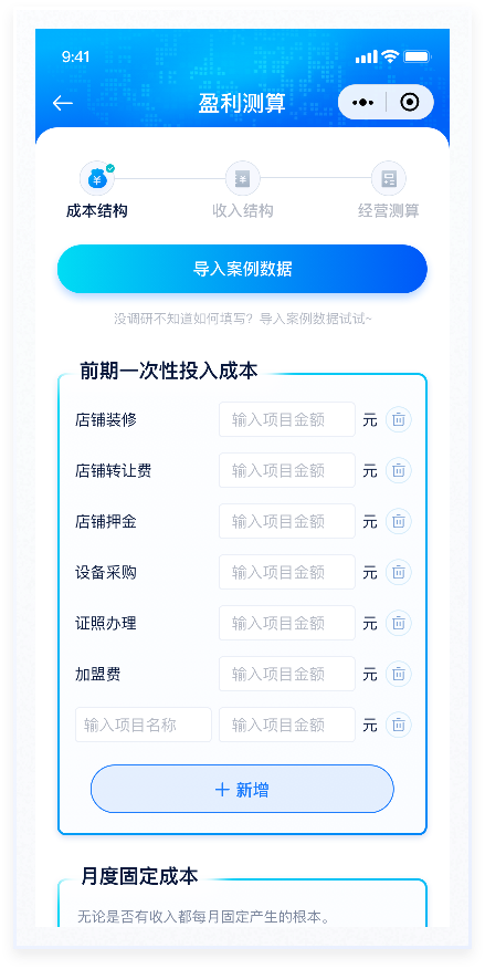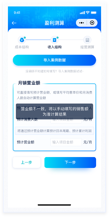 所盈利测算功能是产品的主要功能,通过AI对未来开店盈亏情况进行预测评估。本次设计主要优化该流程的交互及视觉表现,整个流程分为"成本结构""收入结构""经营测算"三个阶段,过程填写情况放置在页面顶部,一步了然。已填写使用主题色标注,未填写则使用置灰颜色处理,符合用户基本感知。按钮使用与主色相近的渐变色。