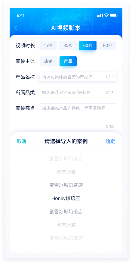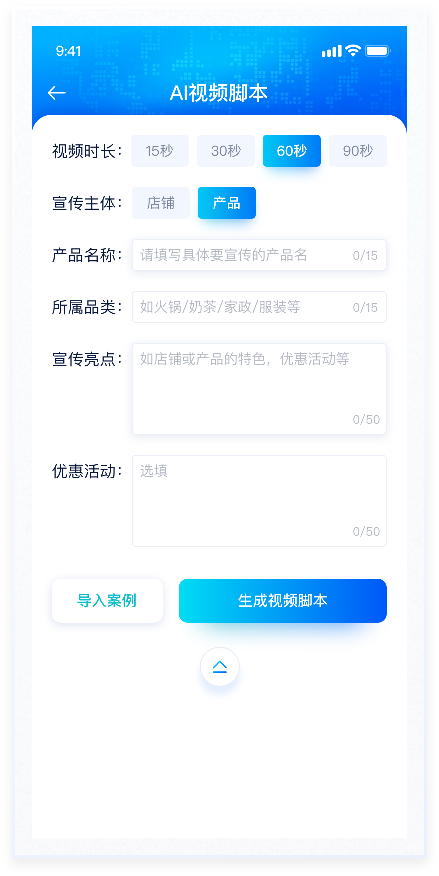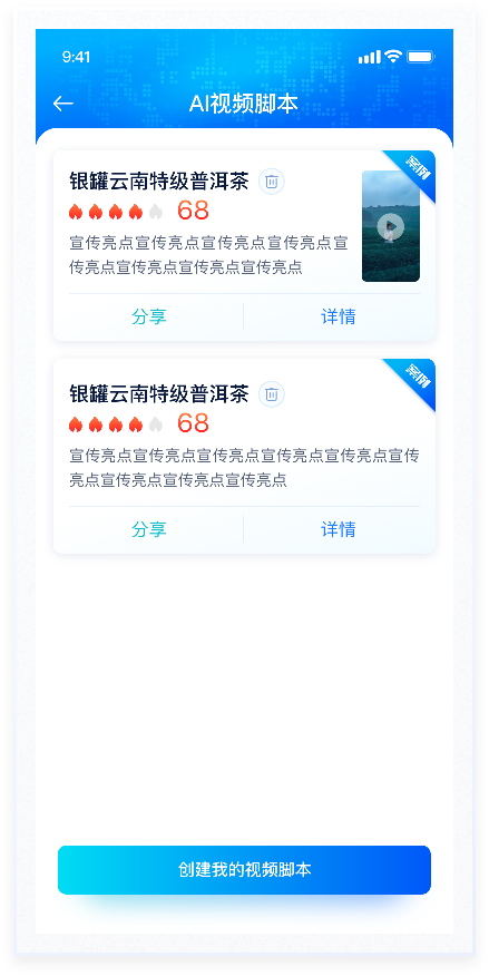 AI生成视频脚本是用户输入相应条件后,AI大模型通过系统算法生成视频内容。整体风格较为科技感,因此在配色上使用蓝色渐变及较重投影,符合产品属性,能够突出产品的创新性和先进性。使用户在使用过程中感受到强烈的视觉冲击和沉浸感,这种体验有助于增强用户对产品的兴趣。