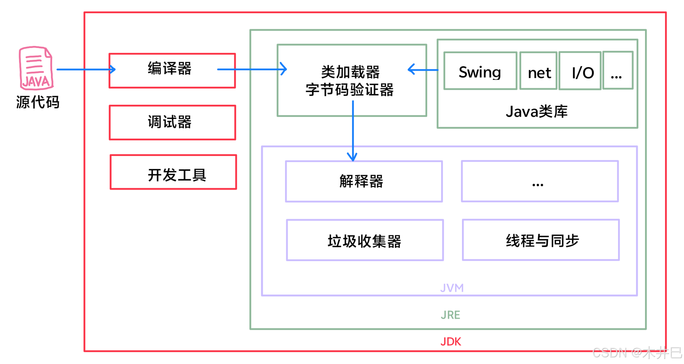 - 再说说和JDK以及JRE的关系。JDK是Java开发工具包,包含了编译器、调试器、各种开发工具和JRE。JRE是Java运行环境,其中包含了Java核心类库和JVM。总的来说,JDK⊃JRE⊃JVMJDK \supset JRE \supset JVMJDK⊃JRE⊃JVM。