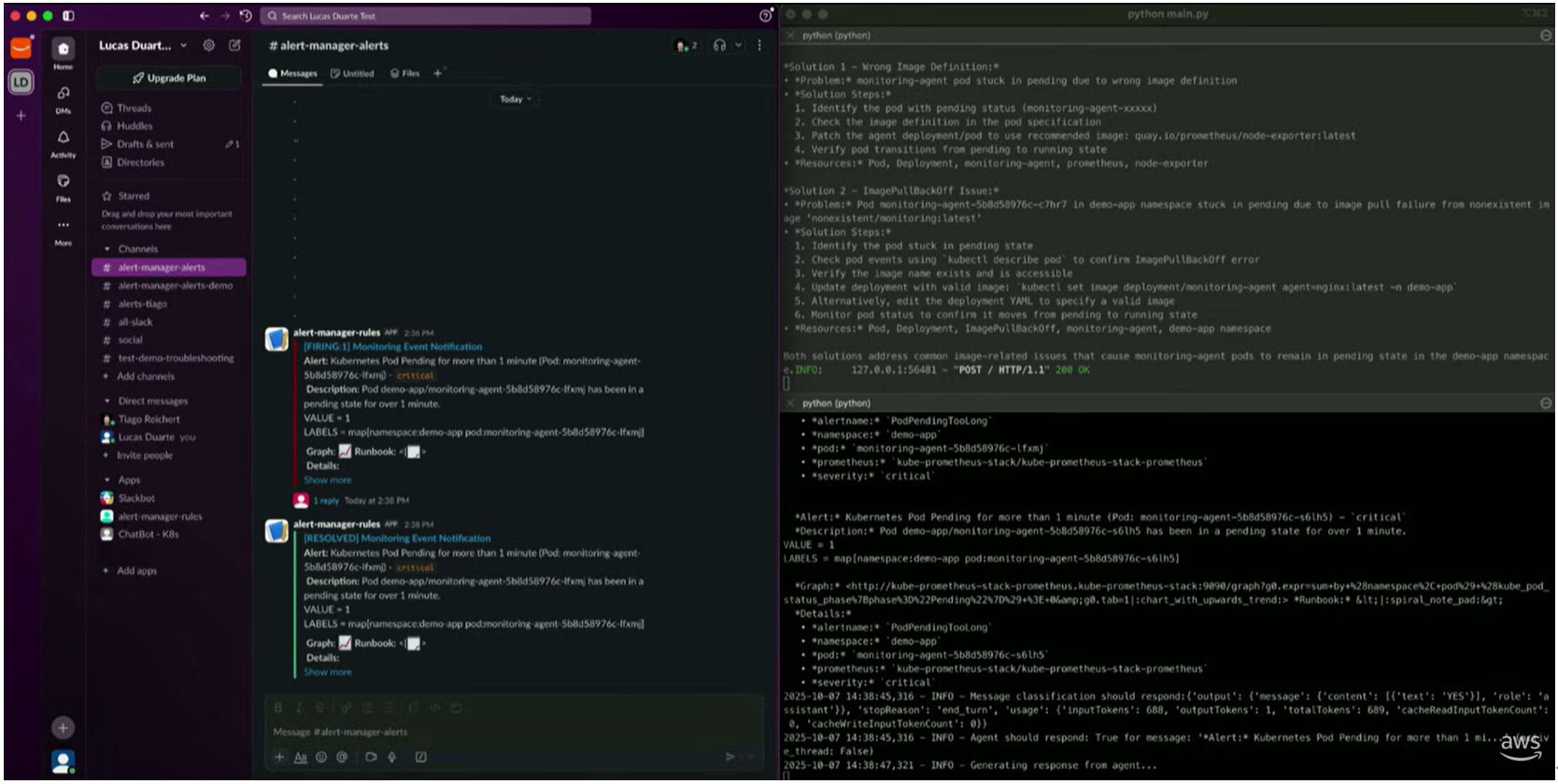 - 语义检索: AI 从 OpenSearch 中提取最近的相关错误日志和调度事件。