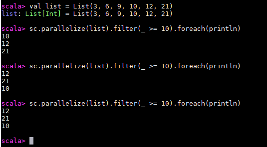 sc.parallelize(list).filter(_ >= 10).foreach(println)