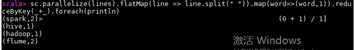 sc.parallelize(lines).flatMap(line => line.split(" ")).map(word=>(word,1)).reduceByKey(_+_).foreach(println)