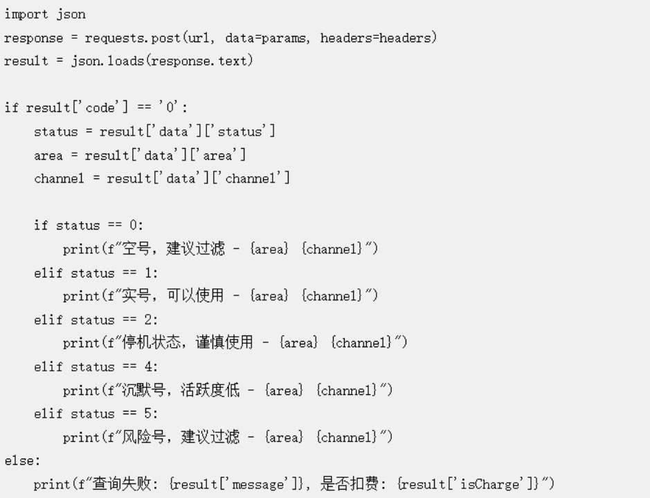 注意事项: 接口文档的data对象说明中字段名写的是 are,但这是一个笔误。根据实际返回的JSON示例,正确的字段名应该是 area(归属地)。在编写代码解析返回数据时,应使用 result['data']['area'] 来获取归属地信息,而不是 result['data']['are']。这个小错误很容易被忽略,但会导致程序运行时报KeyError异常。
