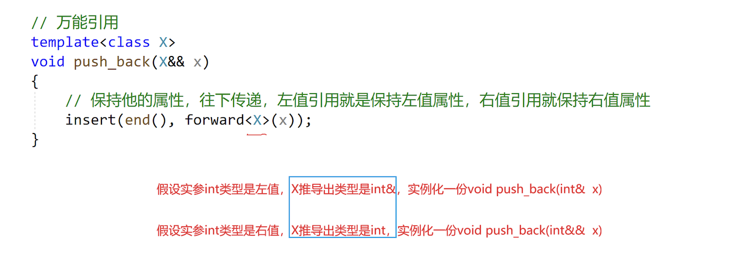 void push_back(T&& x)中的T是已确定的类型 (如string),所以T&&就是string&&------ 纯右值引用,不是万能引用!