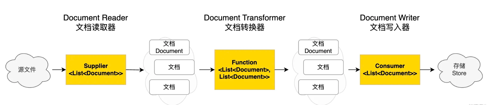 - DocumentWriter:将文档列表保存到存储中(可以是向量数据库,也可以是其他存储)