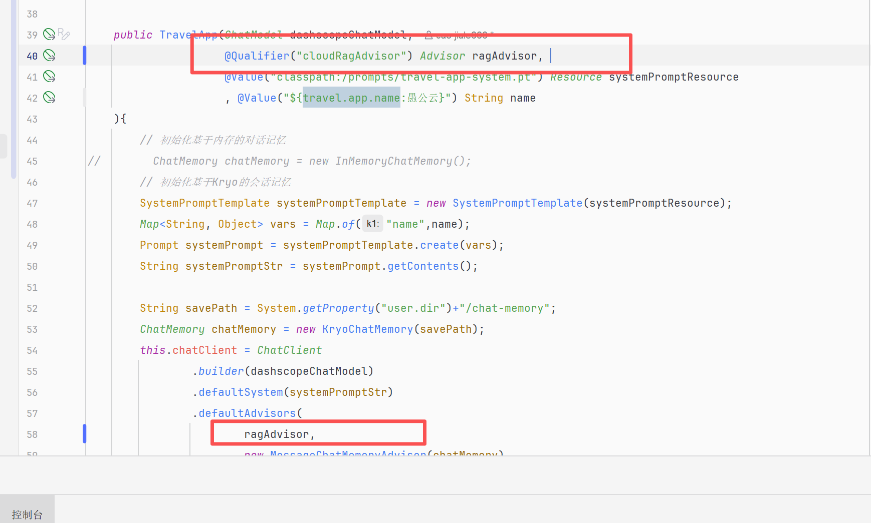 构造函数中不再注入VctorStore而是直接注入Advisor对象,通过@Qualifier注解指定为实例7中的cloudRagAdvisor云知识库检索增强顾问对象