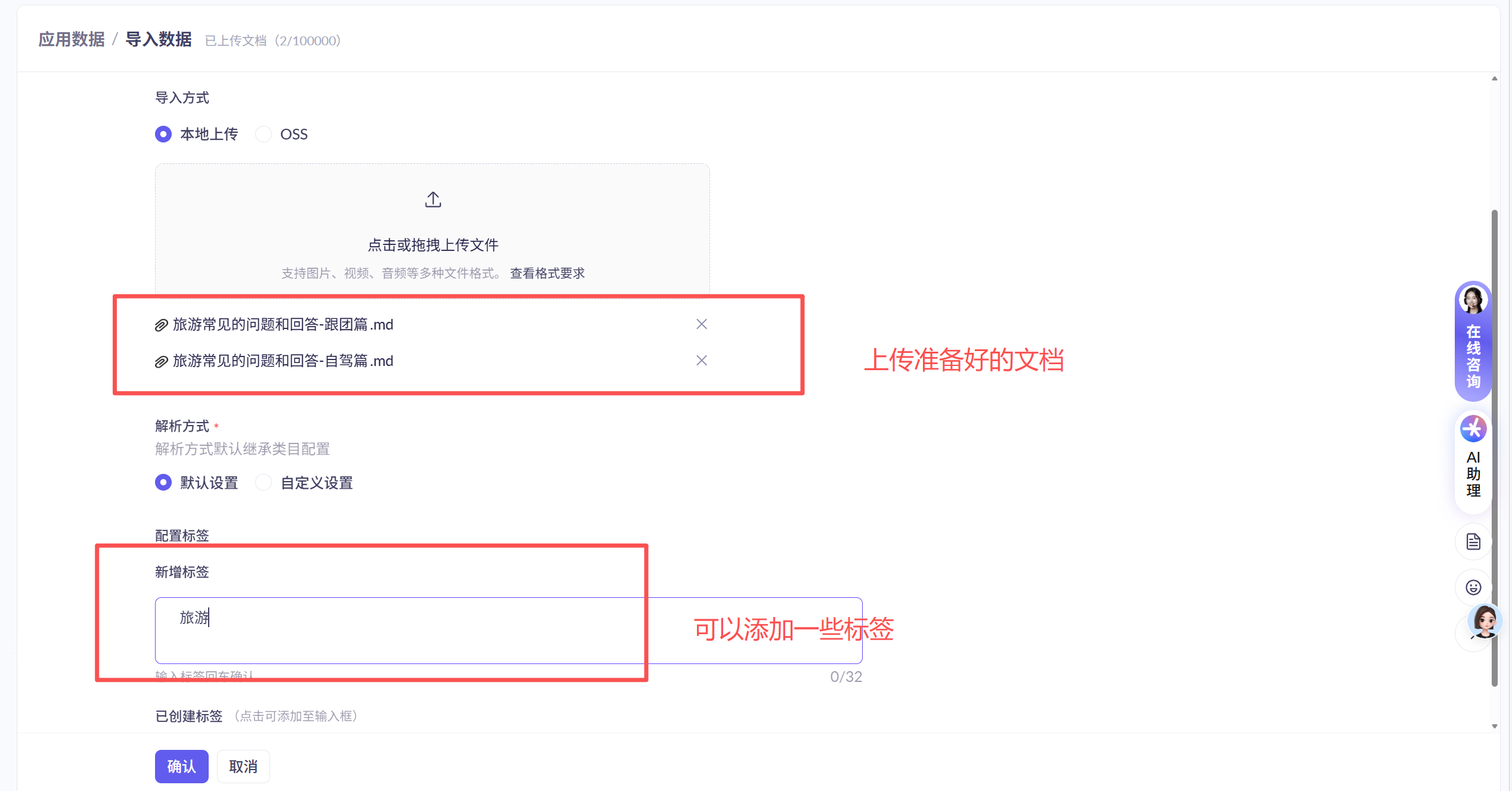 在应用数据模块中,上传原始文档数据到平台,由平台进行解析内容和结构: