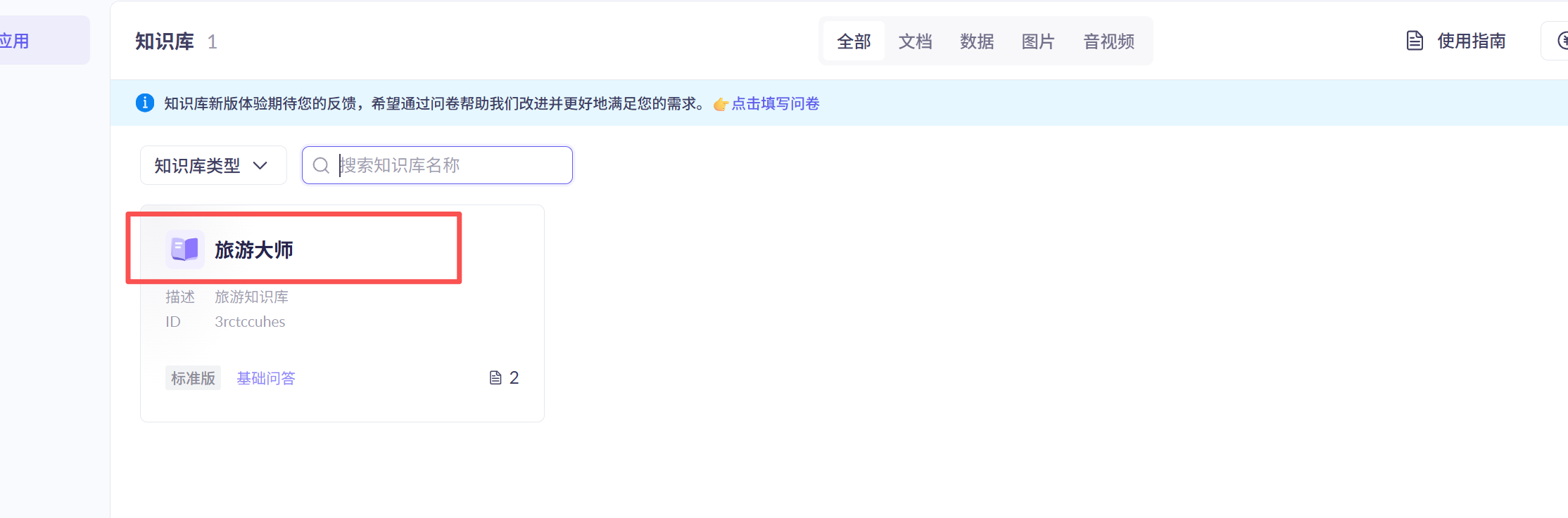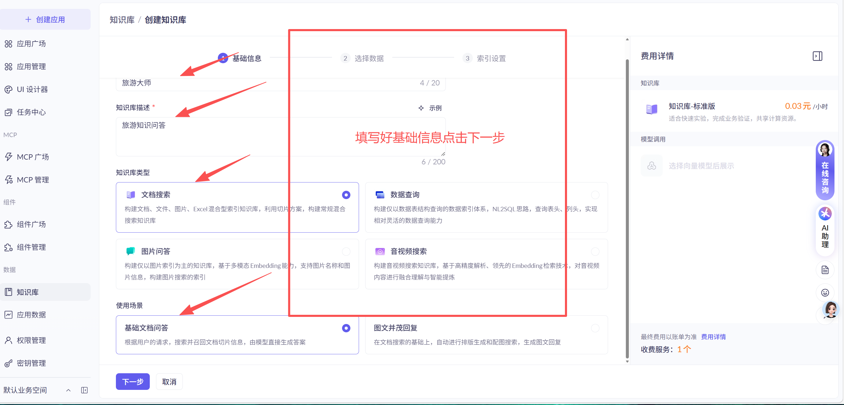 创建知识库名称使用旅游大师,其他默认即可