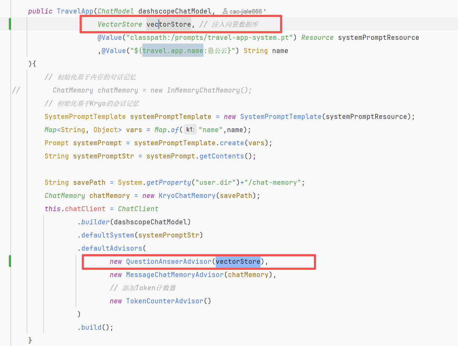 其实要修改的就是上述框中的代码,将我们定义的VectorStore对象通过参数注入,用于创建QuestionAnswerAdvistor知识库问答顾问,并添加到ChatClient的默认顾问集合中这样每次用户提问就会先查询知识库,再进行精确回答