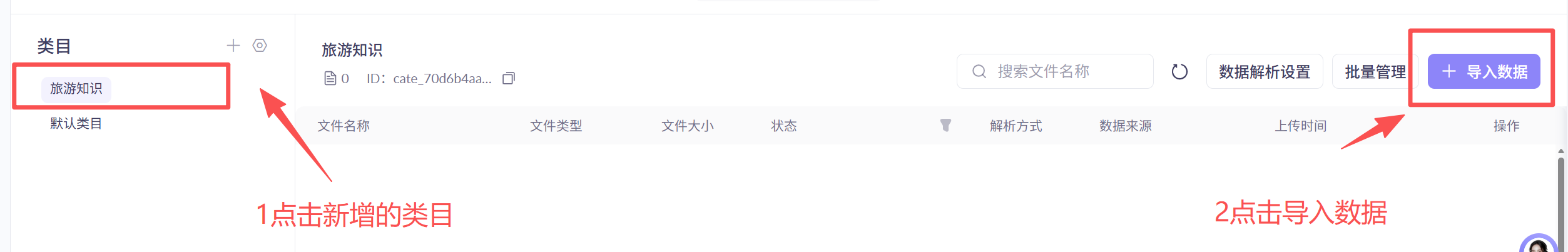 新增后,点击对应的旅游知识类目,然后导入数据按钮