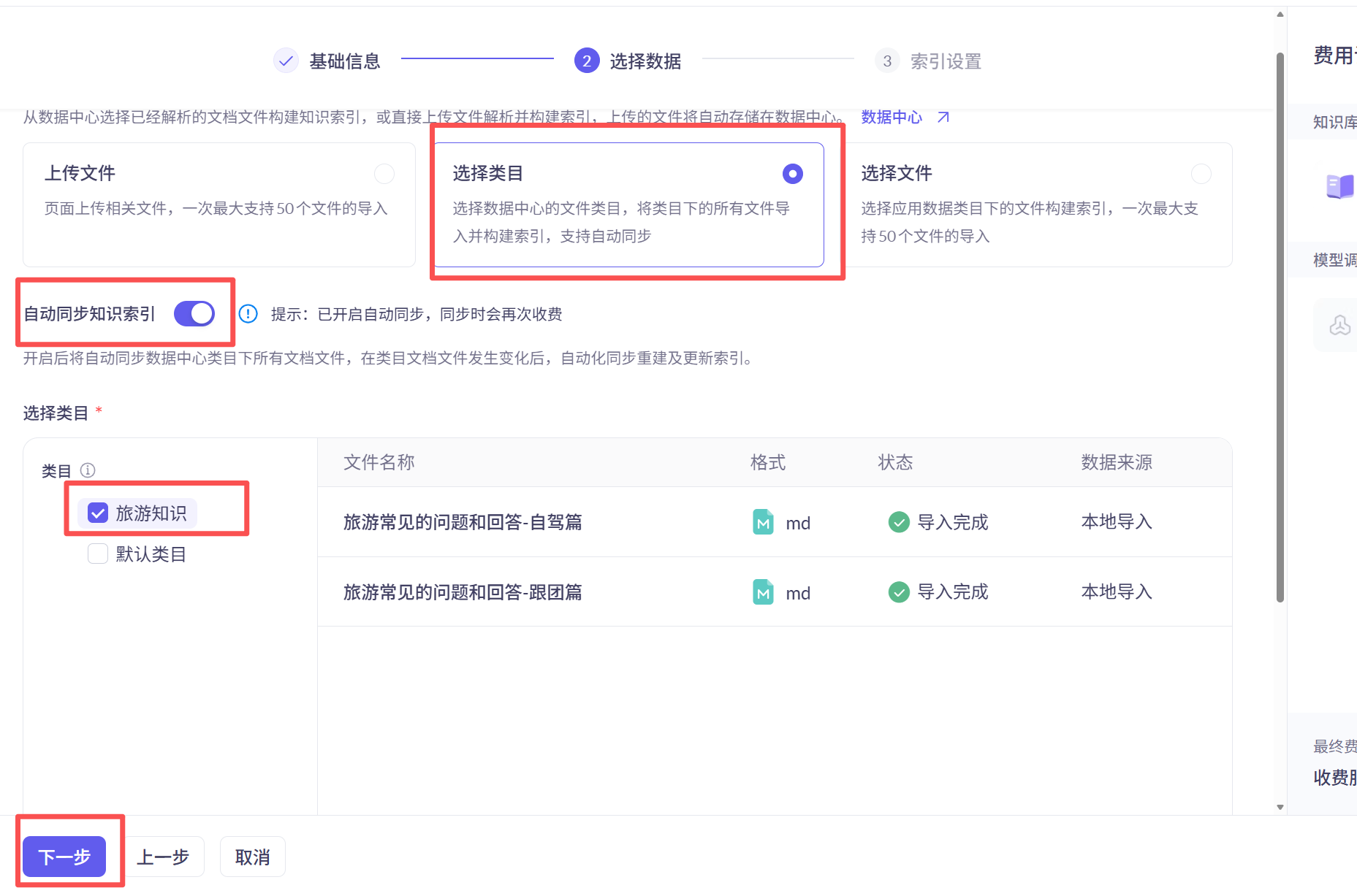 进入到选择数据步骤这里选择推荐类目方式,并开启自动同步知识索引选项。然后选择旅游知识类中的文档