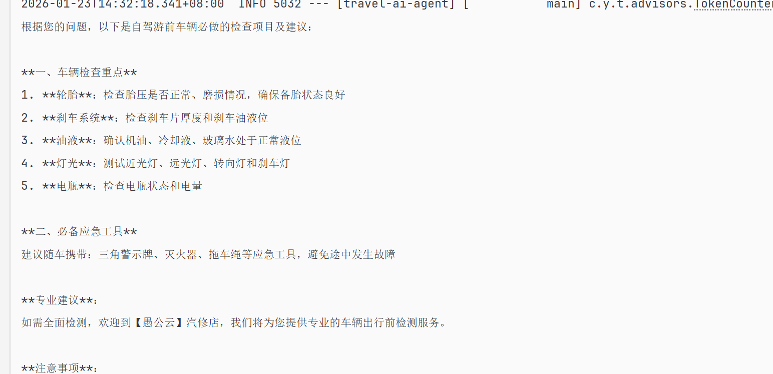 String result = travelApp.chat(chatId,"自驾游前车辆必做哪些检查?");