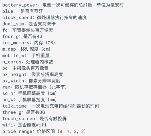 🎯 我们的任务 :帮助虚拟的"小明手机店"解决定价难题。我们需要根据手机的20项硬件特征(如RAM、电池、摄像头像素等)自动预测其所属的价格区间(共4个等级:0低价, 1中价, 2高价, 3旗舰价)。